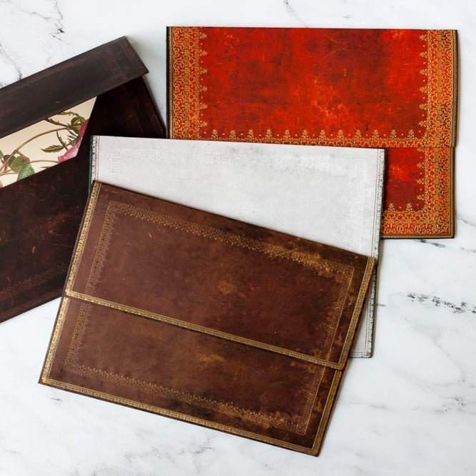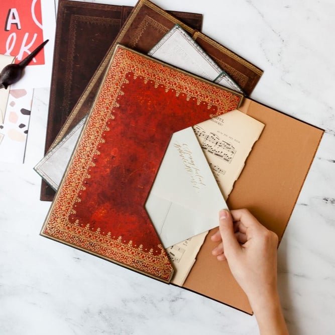 غالبًا ما كانت المغلفات الجلدية في عصر النهضة مصبوغة بألوان غنية وفخمة من اللون الأحمر لتسليط الضوء على الزخارف الذهبية المعقدة لتعطيها جمالا. فقد تم تصميم غلاف مجلد مستندات Foiled بنفس الروح والفكر القديم لتعكس حيوية وبساطة التصميم المميز لتلك المغلفات القديمة.