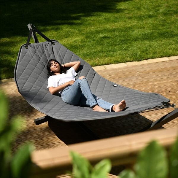 استمتع بأفضل لحظات الاسترخاء مع مرجيحة الهاموك الخارجية بلونه الأزرق المشرق، فهي لا تبدو رائعة فقط، ولكنها توفر أعلى مستوى راحة قد تصل له. قماش الارجوحة المبطن يعطي سرير مرجيحة راحة اضافية بالاضافة الى متانة وقوة تحمل عالية. الطبقة الداخلية من القماش مغلفة لتعطيها قدرة تحمل كبيرة من المطر. كما ان الخامة الخارجية معالجة بطبقة حماية من البهوت بسبب أشعة الشمس. تتكون المجموعة من ارجوحة مبطنة قابلة للفك بسهولة من الاطار الفولاذي، مزودة باطار معزز بحيث تحتفظ الارجوحة على شكلها بدون الالتفاف حول الجسم فور الاستلقاء عليها. ويوجد في المنتصف فتحة صغيرة تسمح بتصريف الماء أثناء المطر. يتم تثبيت ارجوحة استرخاء على اطار مرتبط بالهيكل الفولاذي لمنع الاحتكاك، يعتبر سرير هاموك خيارًا مثاليًا للاسترخاء في الحديقة أو على الشاطئ، حيث يوفر لك تجربة استرخاء مريحة وممتعة تحت أشعة الشمس أو في الظل.